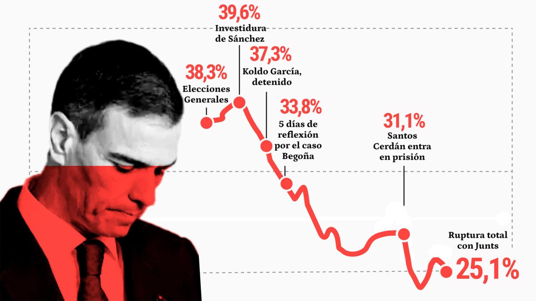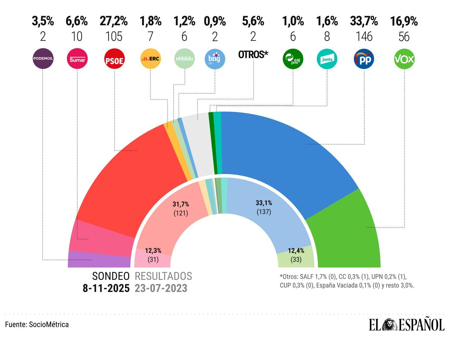 El PP obtendría 146 diputados, igual que todos los partidos del bloque de investidura que auparon a Sánchez, incluido Junts. Más información: Sánchez ha perdido 15 puntos de popularidad en 2 años desde que ‘compró’ la investidura a cambio de la amnistía Noticia completa