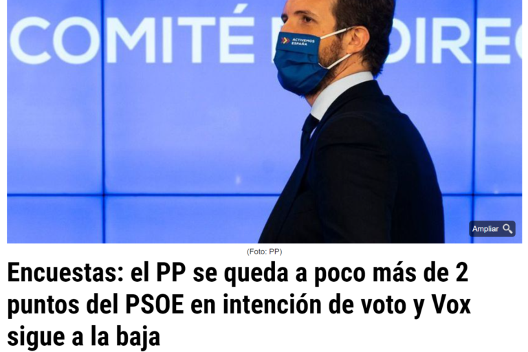 Encuestas: el PP se queda a poco más de 2 puntos del PSOE en intención de voto y Vox sigue a la baja 1 enero, 2021 https://www.diariocritico.com/nacional/encuestas-el-pp-se-queda-a-poco-mas-de-2-puntos-del-psoe