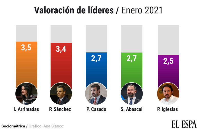 Pablo Iglesias cae del 3,6 al 2,5, Casado pasa del 3,4 al 2,7, igual que Santiago Abascal, mientras Arramadas pasa del 4,3 al 3,5.