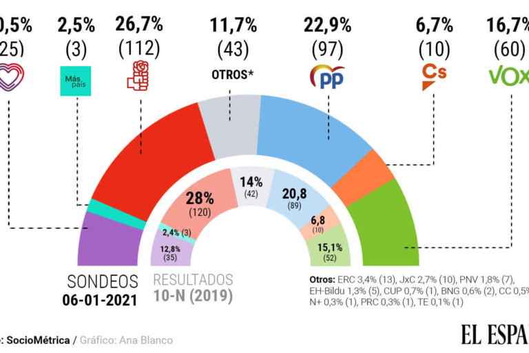 PSOE y Unidas Podemos sumarían hoy 137 escaños. La caída la rentabilizarían Partido Popular (97 escaños) y Vox (60 diputados).