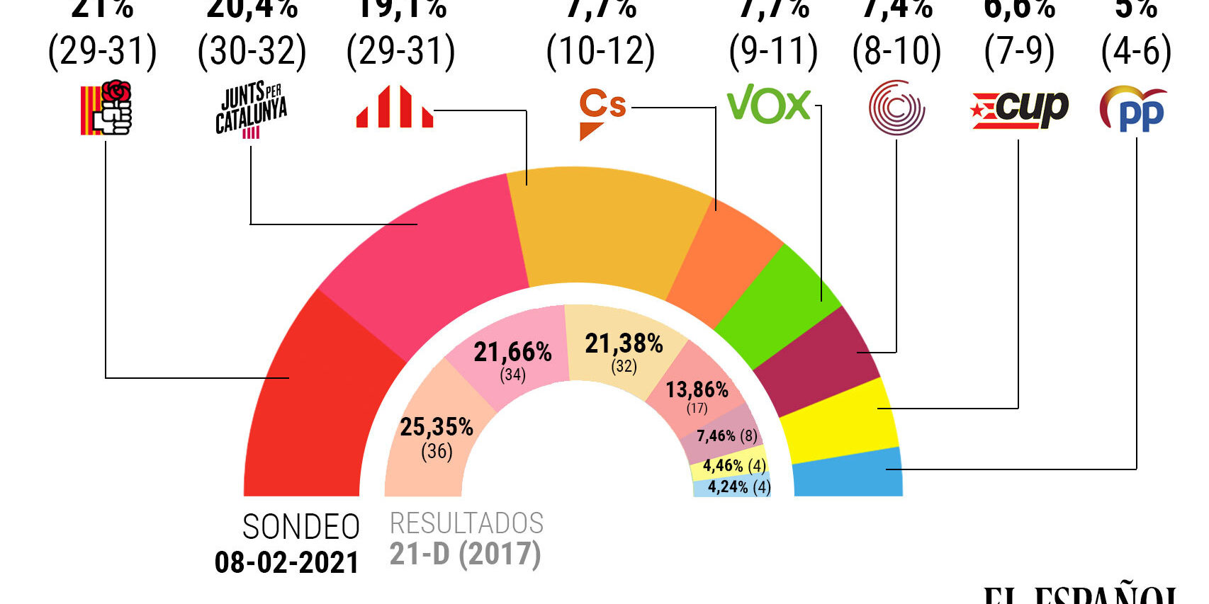 El PSC crece respecto a la encuesta publicada por este periódico la semana pasada. Junts afianza su ventaja sobre ERC. Noticia completa 8 febrero, 2021