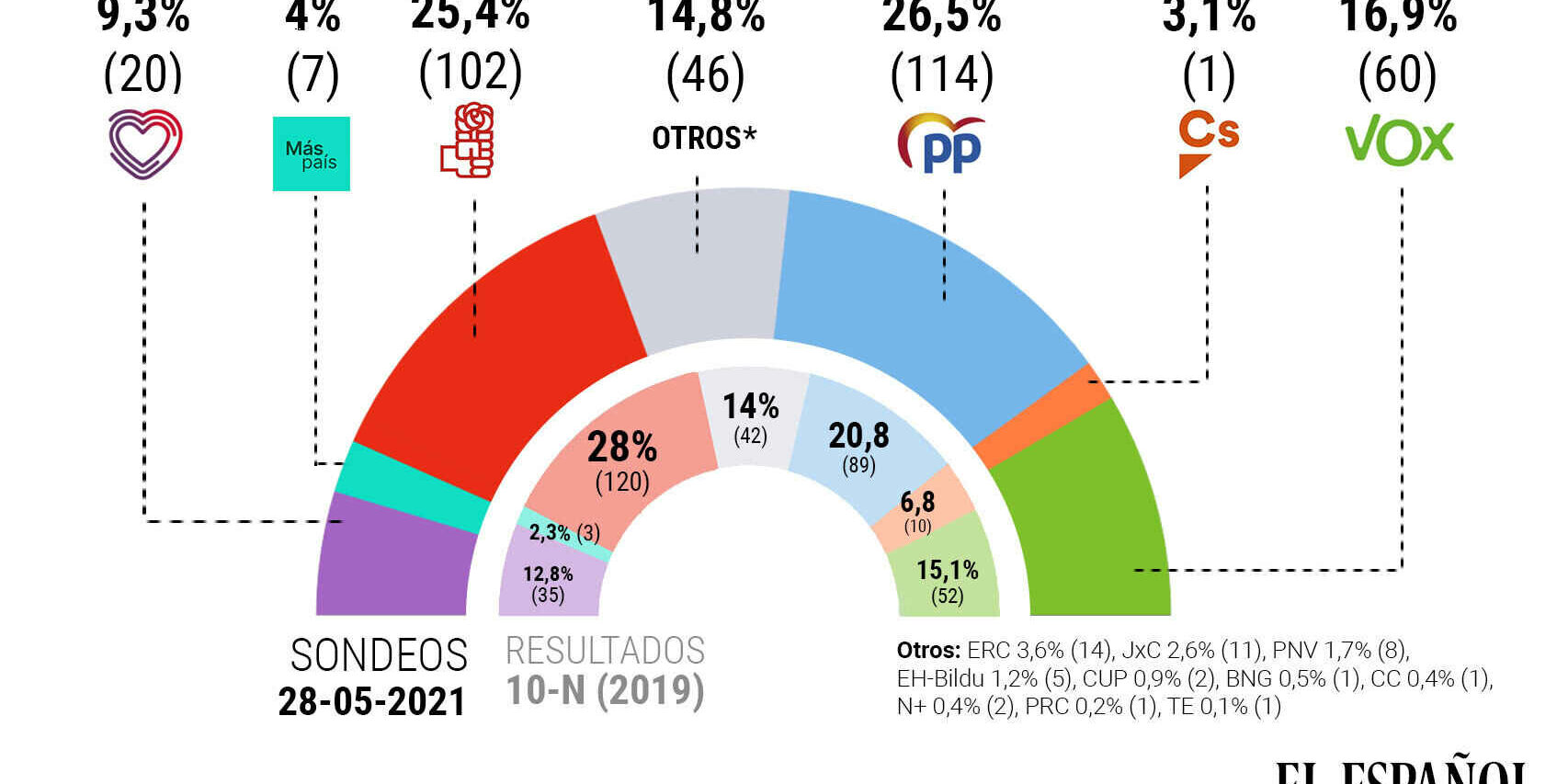 Los partidos de la derecha conseguirían mayoría absoluta en el Congreso de los Diputados. Noticia completa 30 mayo, 2021