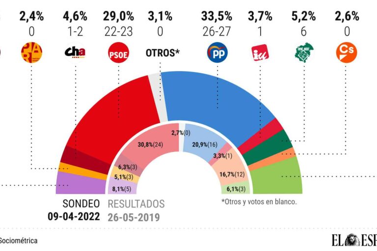 La suma del PP con Vox estaría al borde de la mayoría absoluta, fijada en 34 parlamentarios.