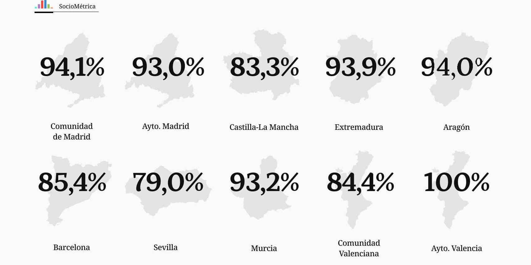 Los sondeos de SocioMétrica anunciaron la mayoría absoluta de Ayuso y la caída de los principales barones socialistas. Noticia completa 31 mayo, 2023