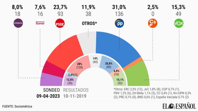 Así lo refleja una encuesta de SocioMétrica para EL ESPAÑOL que será publicada recientemente. Sumar tampoco logra ‘sorpasar’ a Vox. Noticia completa