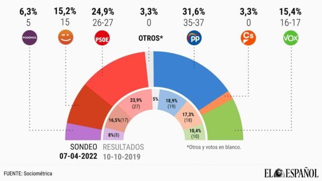 PP y Vox pueden sumar hasta 54 diputados frente al máximo de 48 que la encuesta de SocioMétrica atribuye a la izquierda. Noticia completa