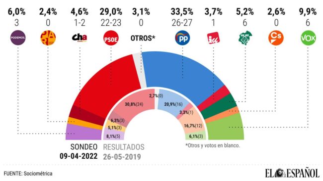 La suma del PP con Vox estaría al borde de la mayoría absoluta, fijada en 34 parlamentarios. Noticia completa