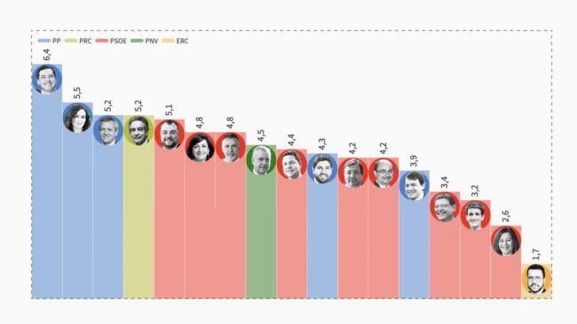 El único presidente socialista que aprueba es el asturiano Adrián Barbón (5). Pere Aragonès, Francina Armengol y María Chivite, los últimos de la lista. La presidenta madrileña es la más popular, la conoce el 97%. Noticia completa