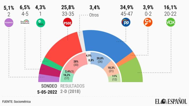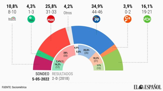 Los populares asegurarían siete escaños; los socialistas y los de Abascal, cuatro. Por Andalucía alcanzaría 2 asientos y Cs y Adelante quedarían fuera. Noticia completa
