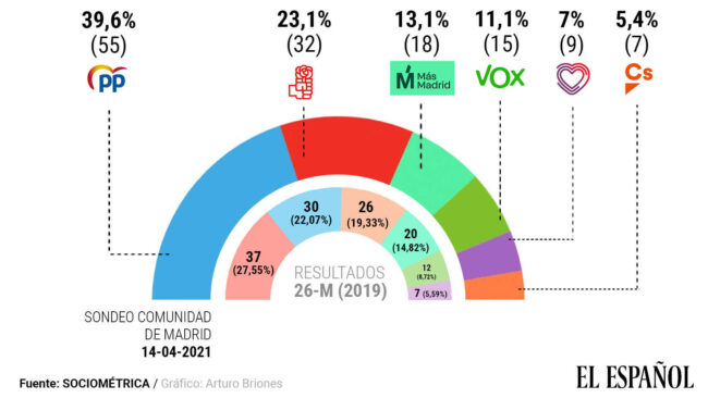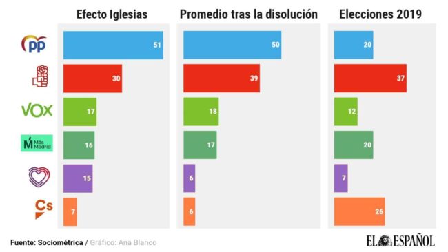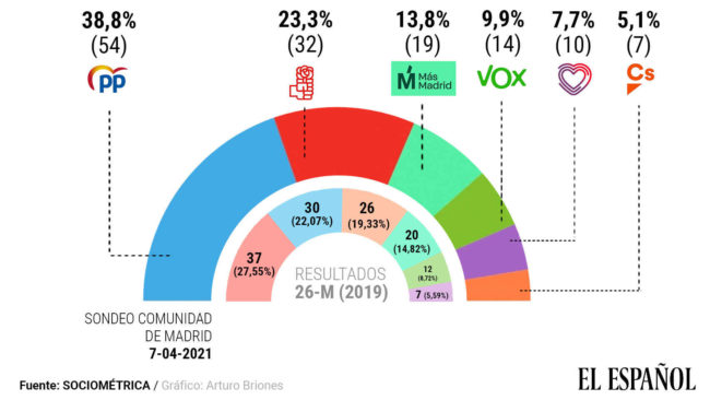 El líder de Podemos obtendría hoy sólo 11 escaños, seis menos que Más Madrid, mientras Ayuso llegaría a los 53. Noticia completa