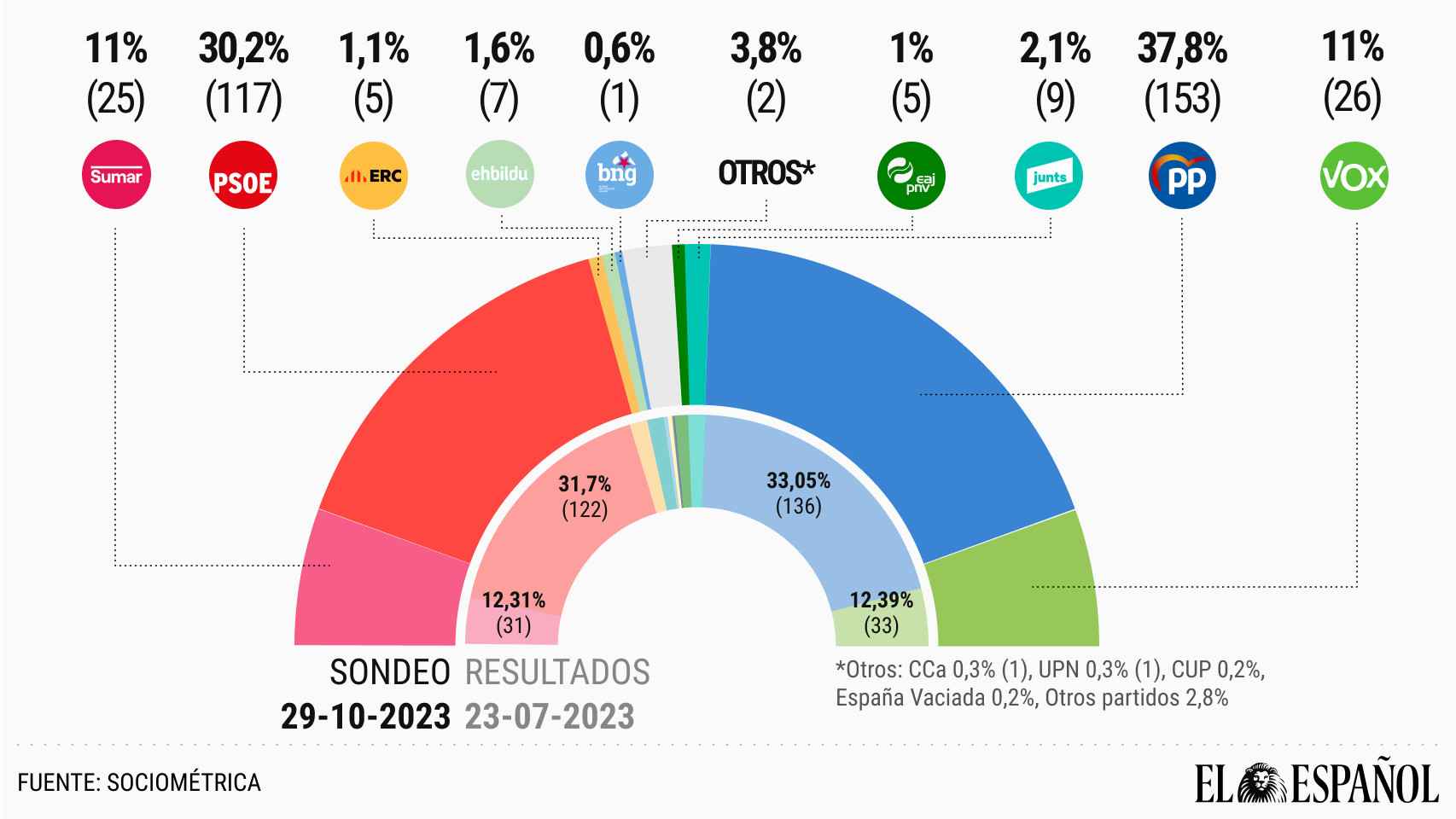 DetallesFeijóo se alimenta de descontentos del PSOE, aunque Sánchez cae menos gracias al trasvase de votos de Sumar. Junts ganaría un escaño y ERC lo perdería, por lo que el independentismo premia la estrategia de Puigdemont. Noticia completa