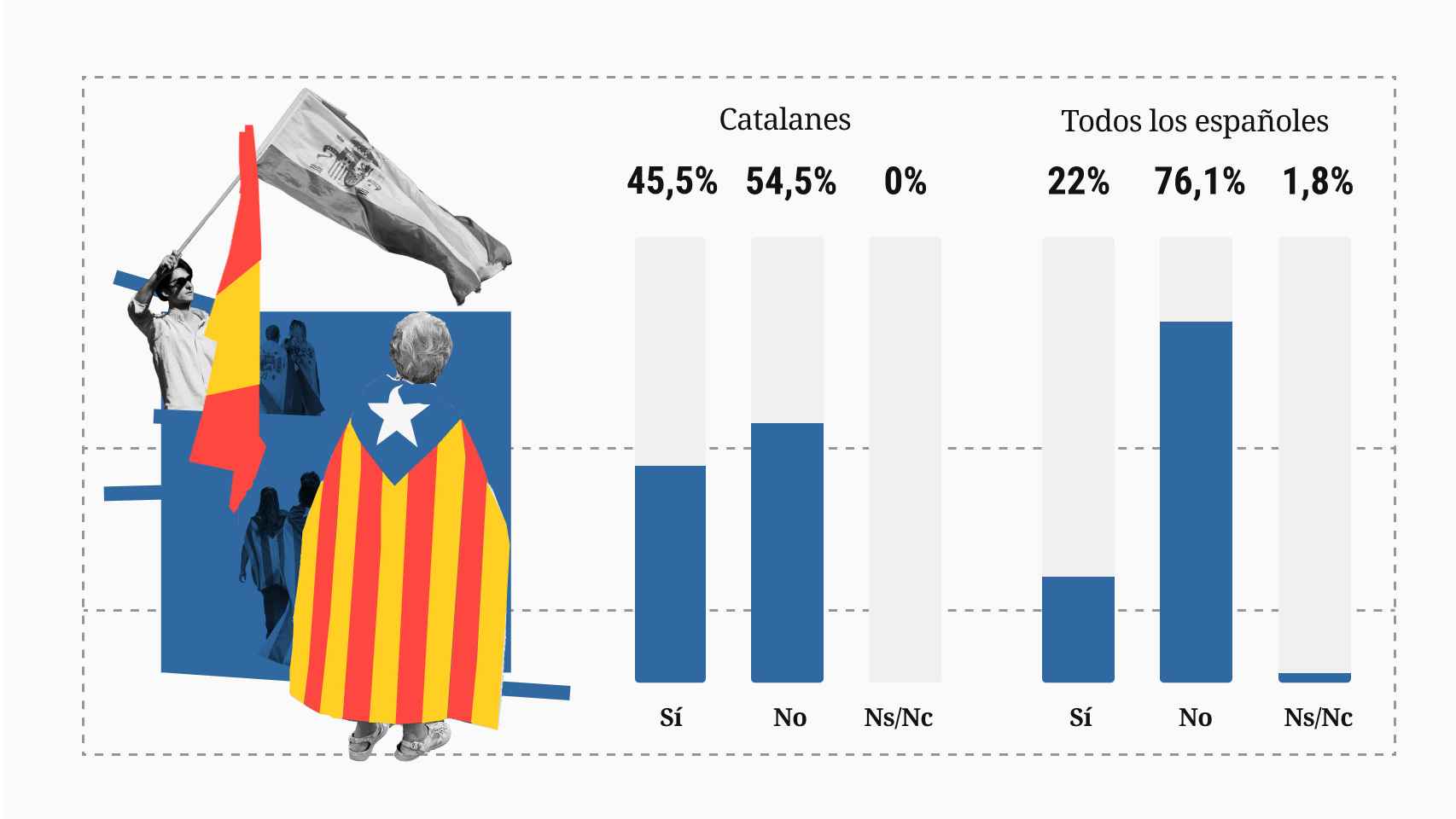 DetallesEl 76,1% de los españoles se pronuncia, rotundamente, en contra. En Cataluña tampoco cuenta con un apoyo amplio: sólo el 45,5% está a favor. Noticia completa