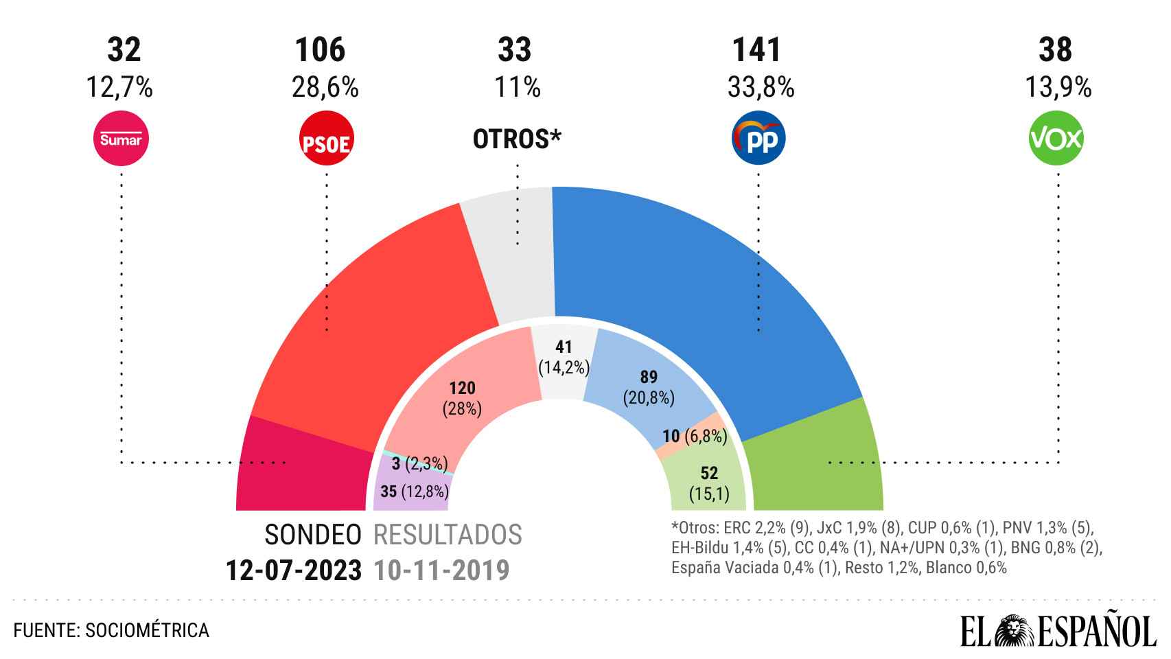 DetallesLas dos formaciones suman 246 escaños. Los votos de Vox pasan a Alberto Núñez Feijóo y Sumar no está recogiendo los de Podemos y Más País. Noticia completa
