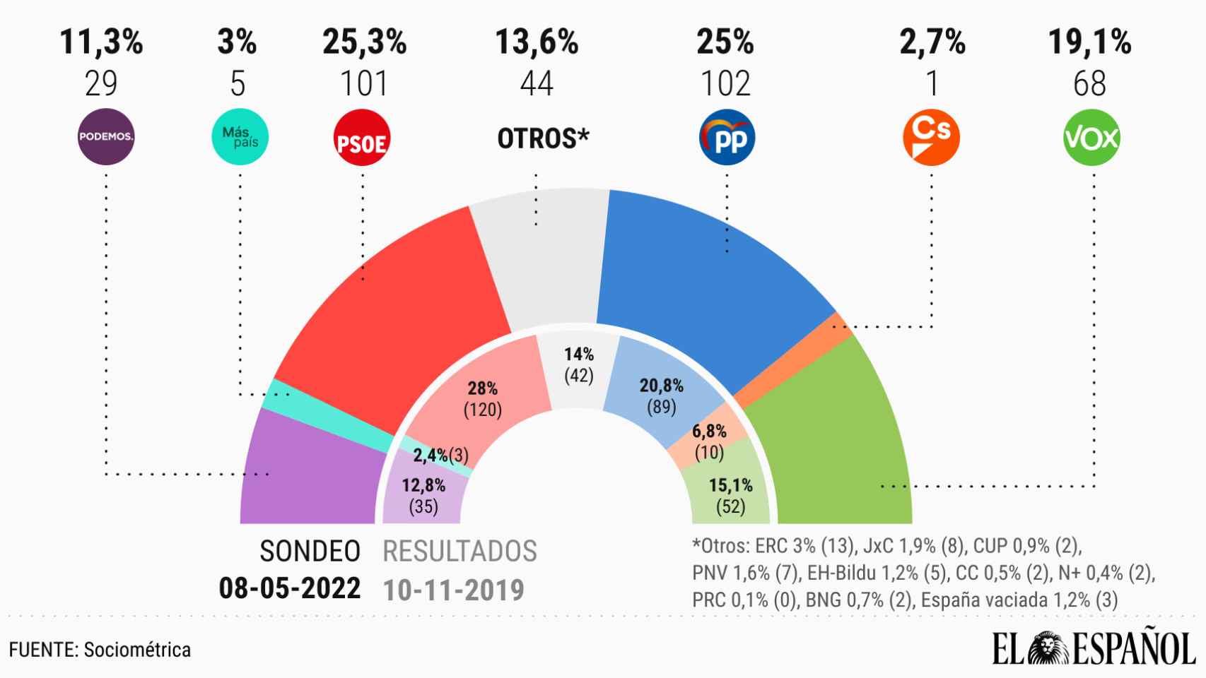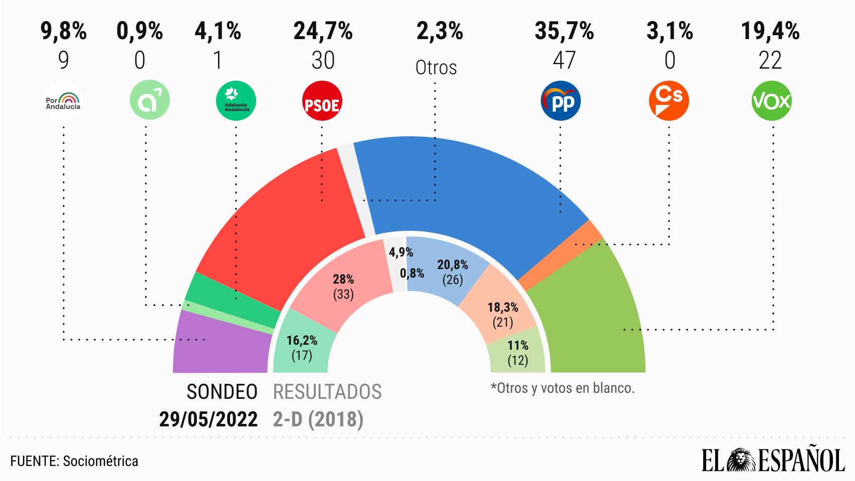DetallesSondeo SocioMétrica.- Tendría 45 escaños frente a los 44 del PSOE y las coaliciones a su izquierda: podría gobernar sin Vox. Noticia completa