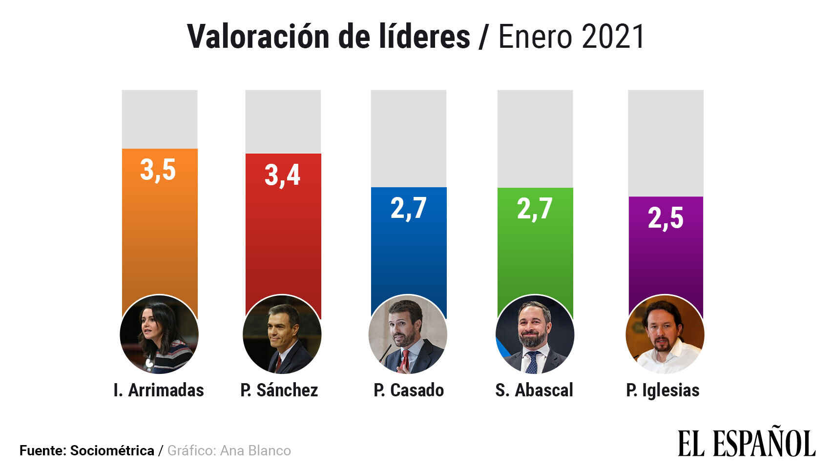 DetallesPablo Iglesias cae del 3,6 al 2,5, Casado pasa del 3,4 al 2,7, igual que Santiago Abascal, mientras Arramadas pasa del 4,3 al 3,5. Noticia completa