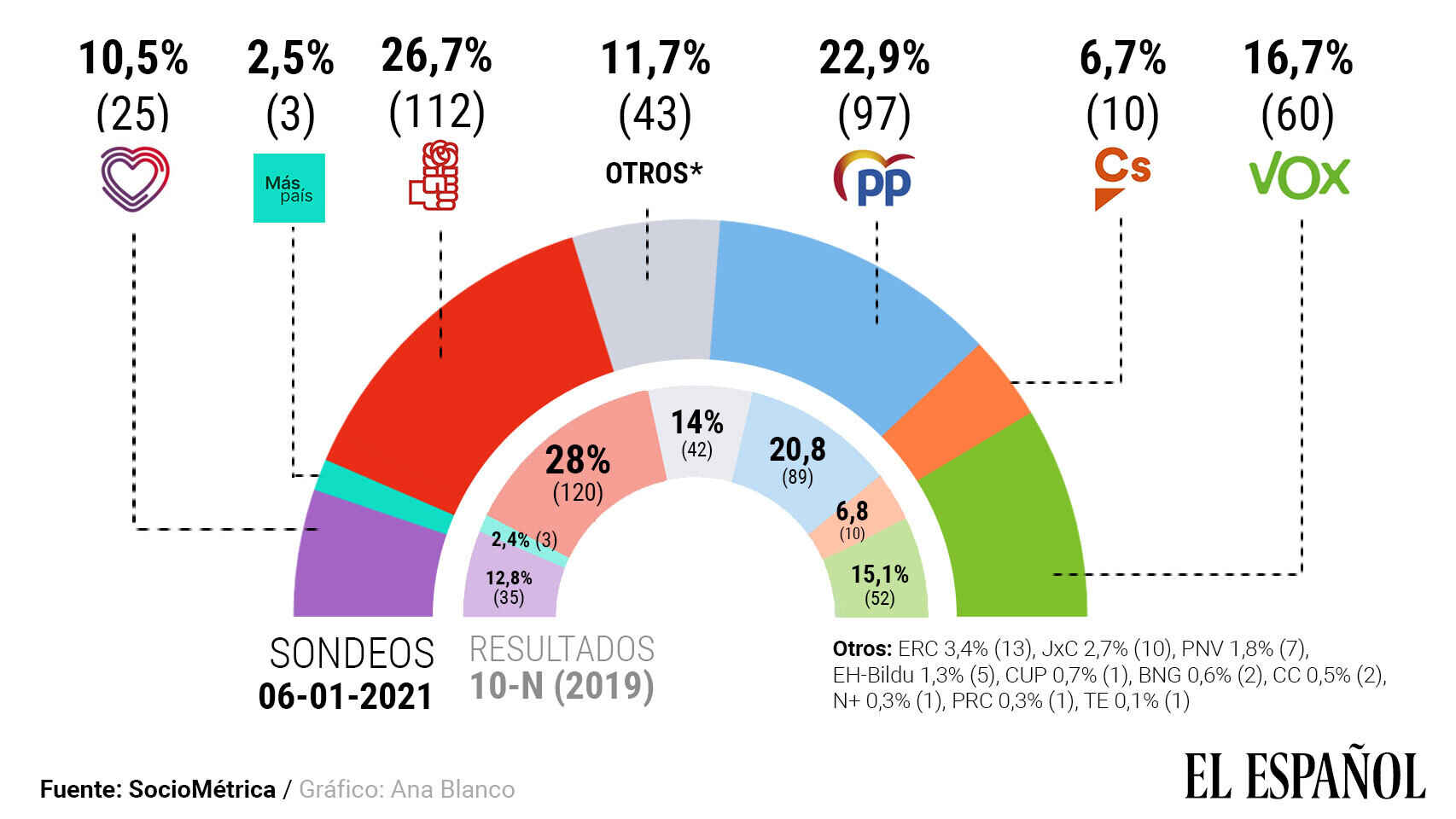 DetallesPSOE y Unidas Podemos sumarían hoy 137 escaños. La caída la rentabilizarían Partido Popular (97 escaños) y Vox (60 diputados). Noticia completa