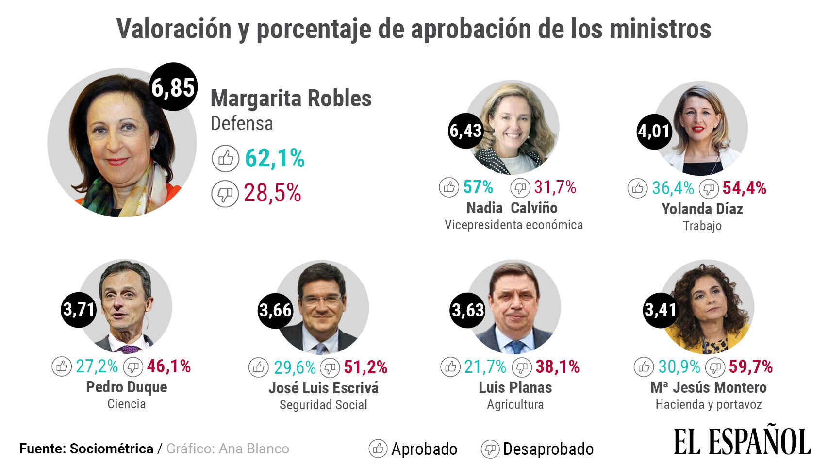 Solo aprueban dos de los 22 miembros que conforman el gabinete de Pedro Sánchez: Margarita Robles (6,85) y Nadia Calviño (6,43). Noticia completa